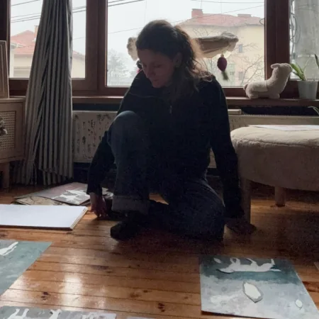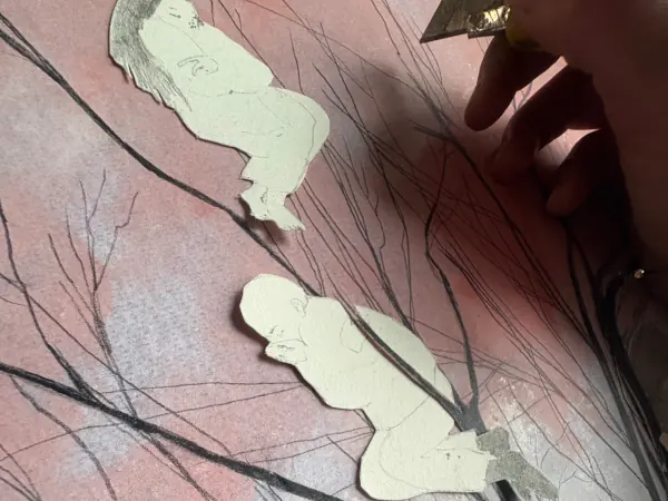 Must be the field that made me suggest in such a vague manner and it manifested in the artworks not solely in the interest and the subjects represented but also in the inclination to hypothetically imagine events like in Puddle egress, which is involved inside an artwork sequence about the eventual existence of hidden objects to discover located somewhere in the field; or The Unobtrusive doll which is a second artwork following the movement of a doll through landscapes. Specifically for this piece I discovered a solution to embody technically what my concept contains and it was done with transparent tape – an evolution of an instrument frequently present in the process which functioned inside Intrusive thoughts (Imaginary friends) as well. Back in the transition of the first two months of the year for me it was restful with the status of a habit to draw tiny figures, delicate to cut out and requiring heavier paper in order to survive: in both artworks these are indirectly present through a transparent tape rectangle inserted additionally to the paper sheet. All six pieces are executed in different paper types varying in weight which is a methodology I value for how it diversifies and unrich the process in sense of texture, approach and decision taking not unlike choosing the right colour. The divergent reaction of each automatically needs a change in the treatment according to its necessities making the process less predictable and more curious. In this period I welcomed long afternoons of attentive cutting on the living room wooden floor where I usually develop and finalise the majority of my artworks. Exception of that standard is the dining table which I prefer for drawing as it distances me from the paper chaos on the floor while also offering stability and concentration to turn into the artistic office needed for drawing the elements to take part in the artworks – day by day I invade more and more room, over placing paper all around my space until there is no more surface to cover.