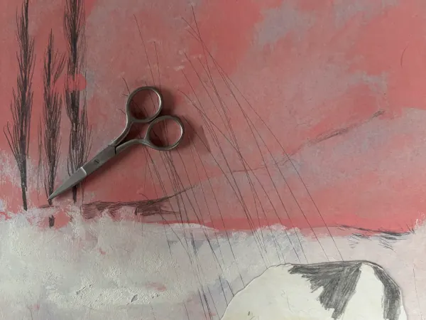 Open, empty and silent the field requires nothing from a passenger other than perceiving the scenery and I do; bringing the impressions with me back at home, in the living room where my studio and paper is. On good days I manage to paint 10 variations representing the field – not the one I saw but how it made me feel through its image; unclear and undefined as if seen through movement (because sometimes I am passing leaning on the car window which is a different way of seeing and a chance to go further and experience larger areas that slightly ever change) because a landscape seen is figurative but a landscape felt is abstract and I seek to stay in the washed line between those two. When I am ready to be concrete as I yet need it, I rely on the edge of a pencil and the deposition of the impressions gained. In order to make them mature the answer is again in the middle afternoon walks in town that will make me confront my work with an evolved approach afterwards. Despite the current winter months I am not always alone on the street – rarely and if the day is lucky I happen to meet an animal, often a lost or abandoned creature I portray to memorise its existence: this, resumed but also overly explained, is the physical and emotional environment in which I worked on six pieces elaborated in January and February: Dilemma, The Unobtrusive doll, Intrusive thoughts, Implantation, Puddle egress and Family tree.