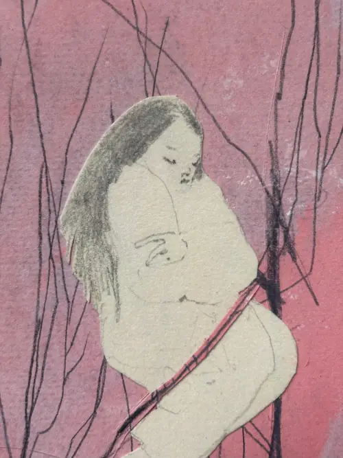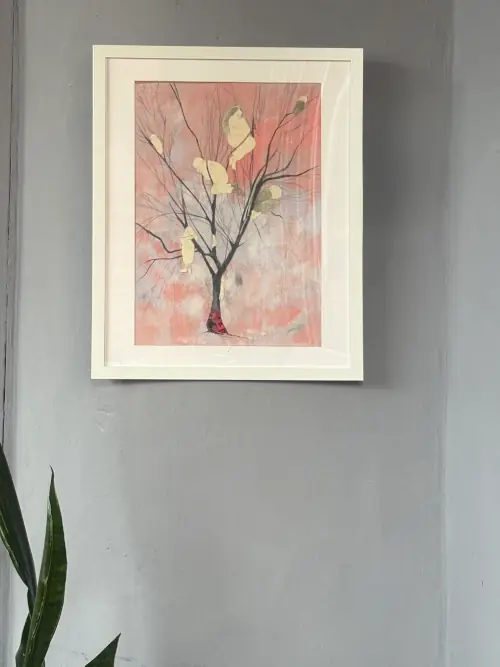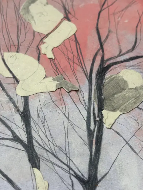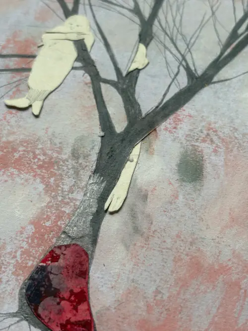 The artwork depicts a walnut tree visible from outside the artist’s atelier; an everyday view towards an abandoned garden currently in process of construction. The piece is part of the artwork sequence Humanest and elaborates the idea of connection and belonging.